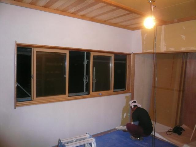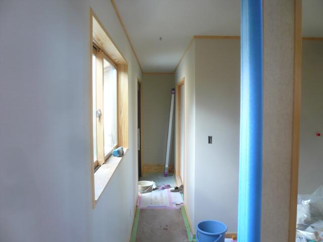 | 小上がりの壁は塗り壁で仕上げます。塗り壁も天然素材の材料を使用しています。 | 2階の和室も、塗り壁で仕上げます。2階の和室は左官が仕上がったあと、アクセントで裾張りをする予定です。 | 中はほぼ完成です。あとは養生を剥いで、クリーニングをすれば完成です。 |