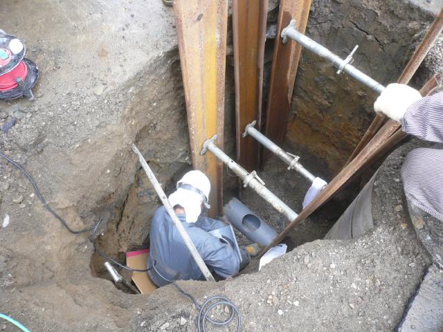| 最後に下水管の取り出しをします。道路を掘削して、排水管を接続します。深さは1.5m程掘ります。 | 廻りの土が崩れないように、矢板を入れながら施工をしていきます。 | 取り出しが終わり、砕石を何度も転圧して埋めていきます。あとはアスファルトで復旧します。 |
