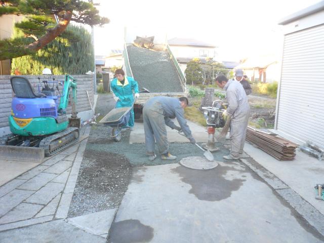 | 砕石で高さ調整をして、ワイヤーメッシュを並べてコンクリートを打つ準備をします。 | 一輪車で生コンを奥から押し開けて、均らしていきます。 | 天気が良いので、コンクリートの水引も早いです。養生期間をとって、型枠をバラします・ |