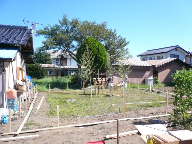 | 8/22 既存建物の隣に、お稽古棟の新築です。 丁張りと地鎮祭の準備です。 |