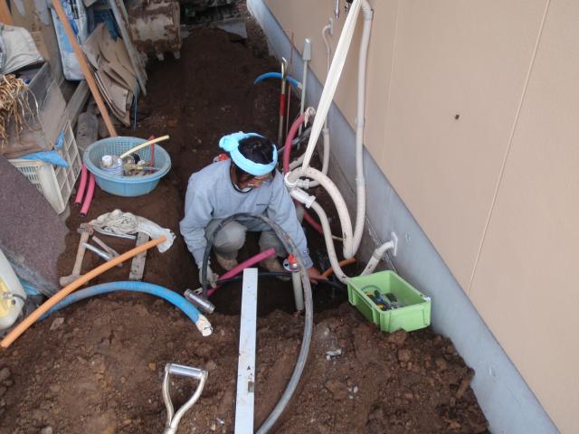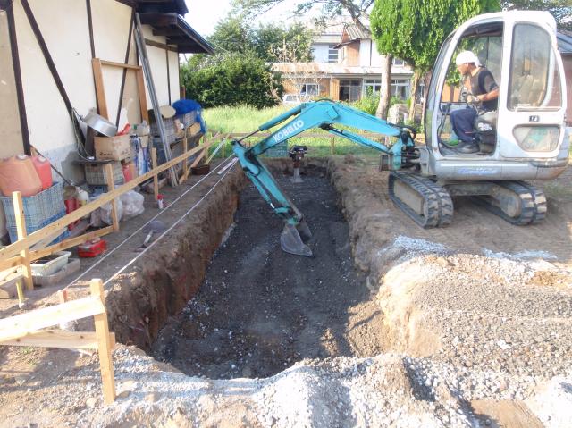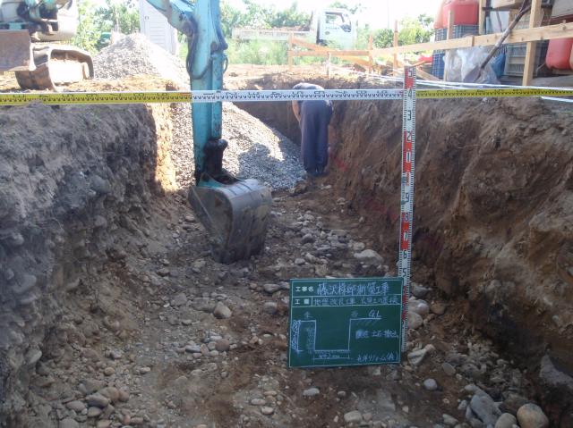 | 地盤調査をすると、一部に軟弱地盤が・・・ | 砕石との入替で、軟弱地盤の改良をします。 これで瑕疵担保保険もクリアーです。 |