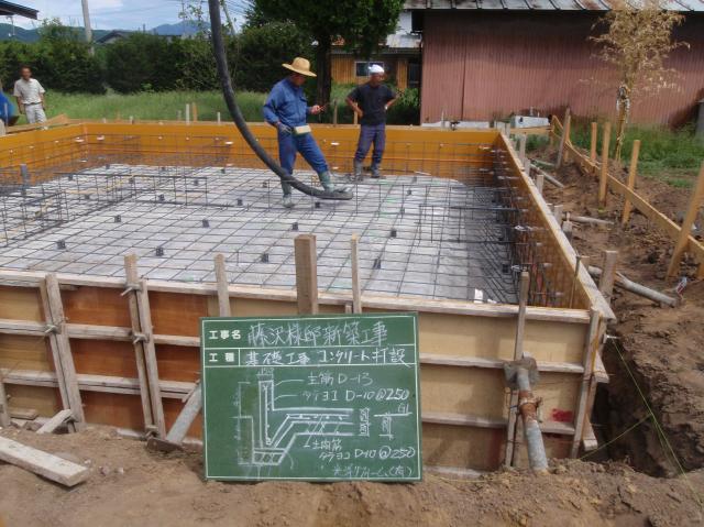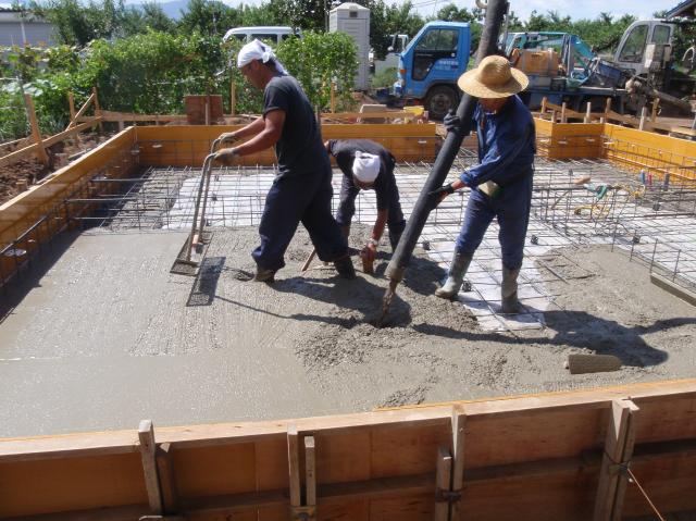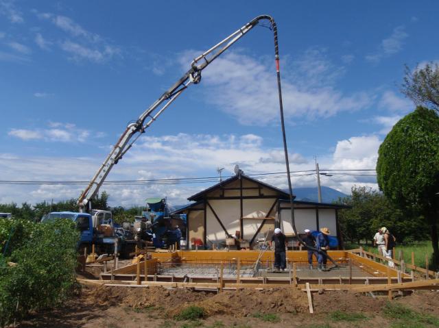 | 配筋完了、検査も終了、今日はコンクリートの打設です。 | 真夏の青い空に、ポンプ車のアームがまぶしい! | その下は、いつものコンクリート打設の風景、 まるで田植えをしているようです。 |