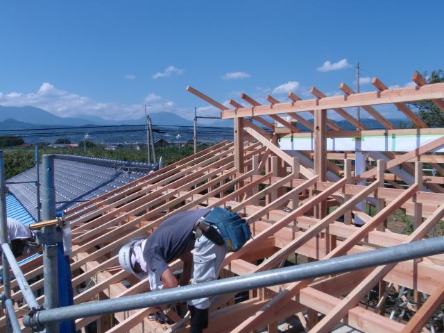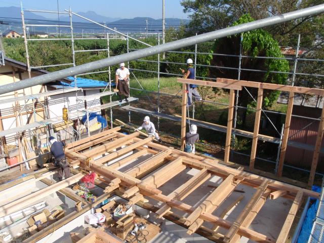 平屋建てと言うこともあり、午後も早いうちに垂木が並びます。 |