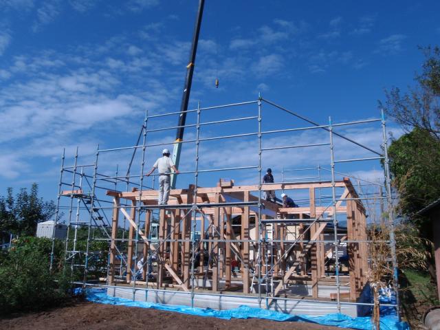 | 青空にグーンッと伸びるクレーン車のブーム・・・ やっぱり青空の下での棟上げは、気持ちがいい。 |