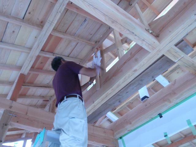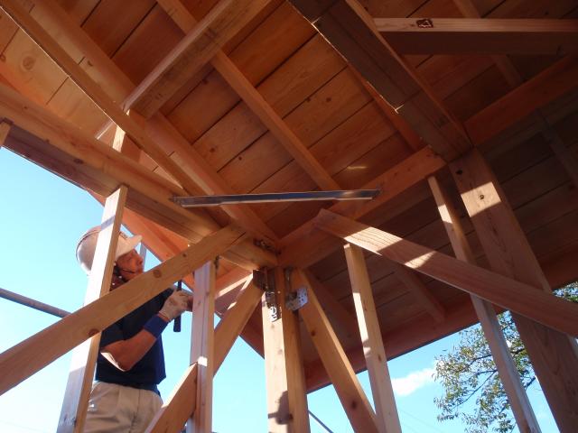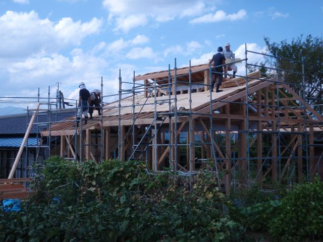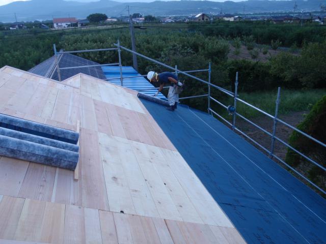 | 野地板も打ち終わりそろそろ建前もお終いです。 | 棟梁に、棟札を取り付けてもらって建前終了です。 | 大工が帰った後も、一人屋根やさんはルーフィングを敷いていきます。雨が降ったら大変だから、頑張るのです。 |