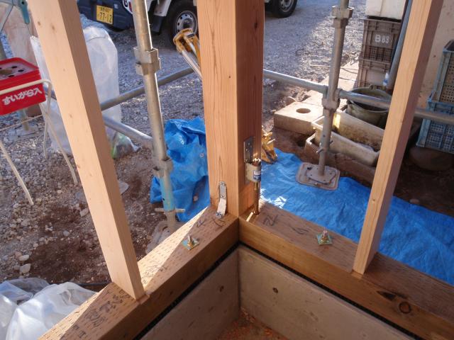 | ホールダウン金物の取付です。 | 上部ホールダウン金物と火打梁の施工。 | 瓦工事も平行して行います。 |