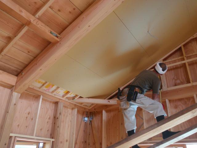 | 金物の取付が終わると、今度は荒床の張り込みです。 | 外壁に9㎜ベニアを張り、その上にモルタル仕上げです。 | 壁天井に断熱材を入れ、ボードを張ります。 |