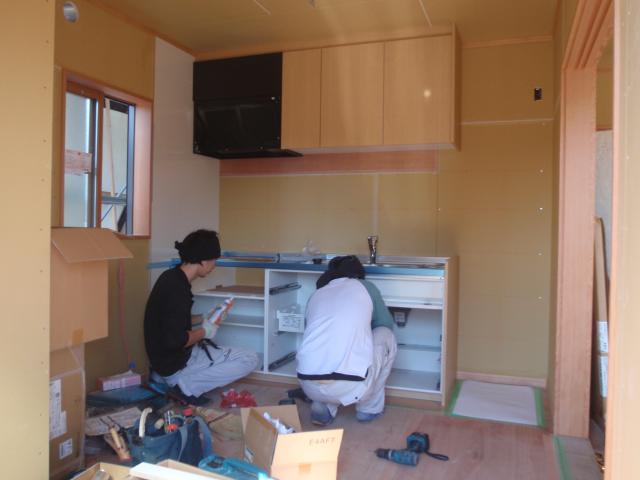 | 壁の断熱材施工状況です。 | 中央の壁コンパネ部分には、お稽古用の大きな鏡を取り付けます。 | キッチンの組立です。 |