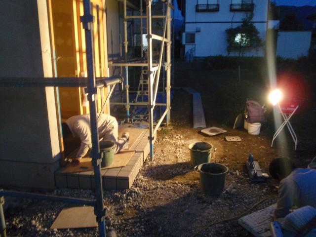 | 稽古場のこけら落としが近づいています。 間に合うように照明を付けて玄関タイル工事。 |