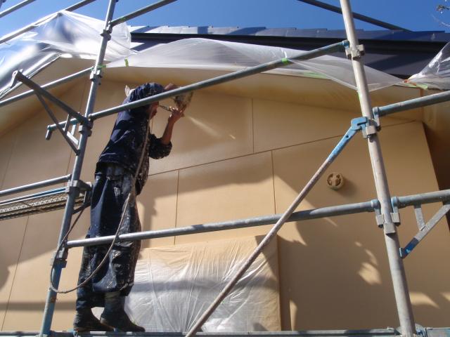 外壁の吹きつけです。 | 色見本で見ると、結構強い色のようでも、大きな面積になると、丁度いい色合いです。 |