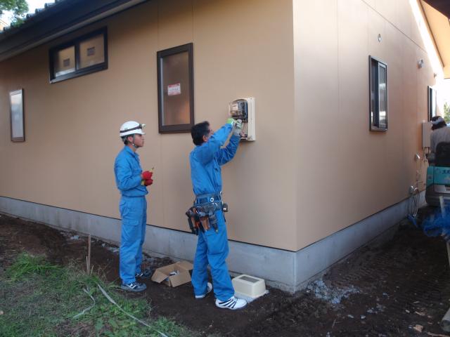 電気の引き込みと、メーターの取付作業。 完成間近ですね! |