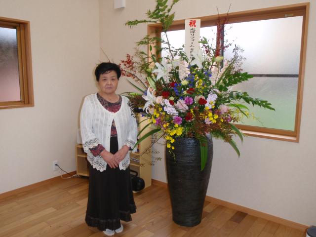 | これで本当の完成です。 | ウッドデッキの取付完成。今度はお孫さんが帰って来るたび、バーベキューパーティーが出来ますね。 | お祝いのお花とともに、 ”おめでとうございます!” |