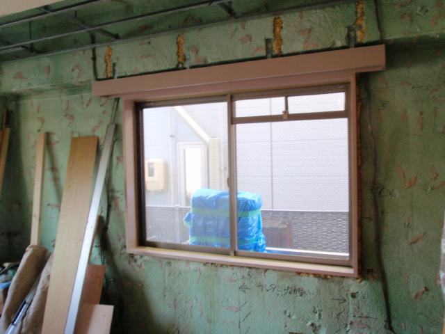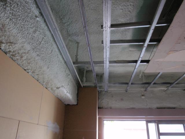 | ウレタンを増し打ちするので、壁厚がふけてくる為、窓枠やカーテンボックスの付け直しをします。 | GL工法で石膏ボードを張りし上げます。 外壁だけでなく、天井部分も外壁から1mまでウレタンの増し打ちをしました。 |