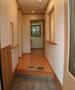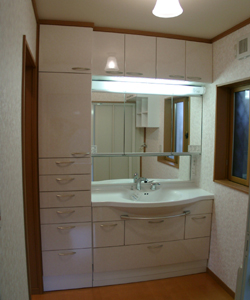 | 洗面台に収納をたっぷり設け、スッキリしたスペースになりました、。 | 収納スペースをつけ、奥様の希望で鏡もとりつけました。 | 玄関は広く、靴箱は壁内に収納。 広く見えるように工夫しました。 |