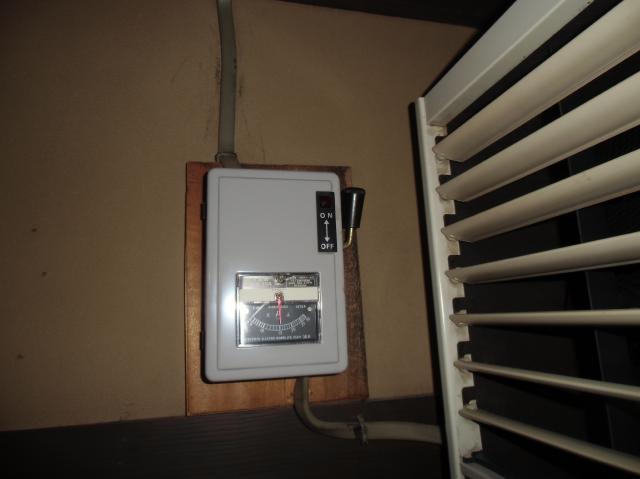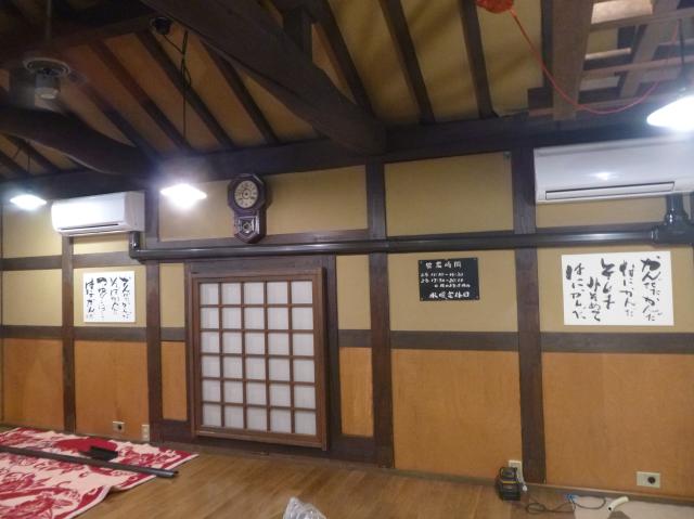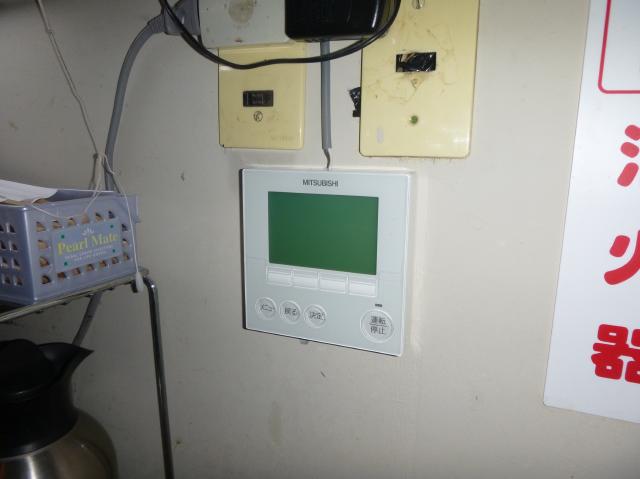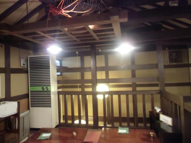 | 完成しました。座席数が多い2階には、2台のツインエアコンを設置しました。 | エアコンのリモコンです。これで1階と2階のエアコンの温度設定などができます。厨房のすぐそばです。 | 急激な温度変化をさせるとエアコン自体が壊れ易くなり、効率も悪くなります。温度調節などはほどほどが一番です。 |