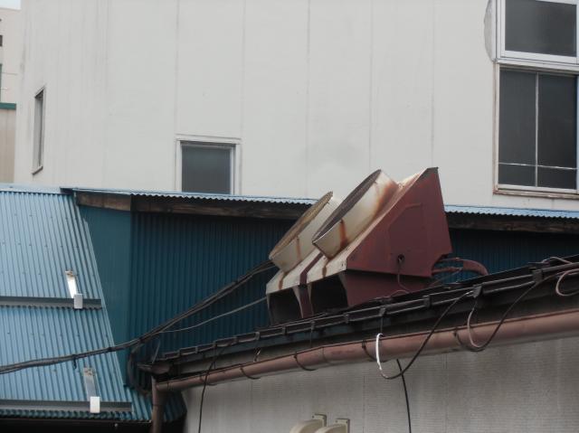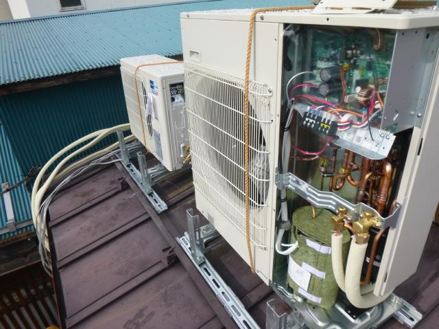 | 床置きのパッケージ型エアコンです。ドレン管の水漏れが激しくなってきました。これ2台を入れ替えます。 | 屋根の上に乗っている室外機です。熱交換用のファンだけです。どうやって降ろそうか? | パッケージエアコンが2台あります。電源も3相動力です。 |