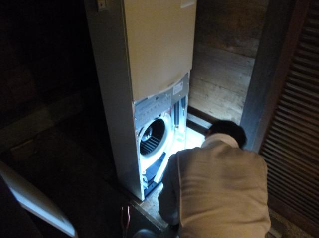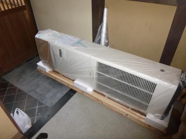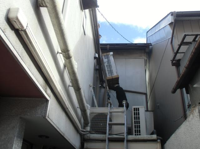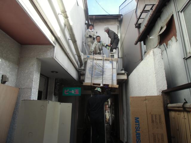 | 1階のエアコンの撤去をします。ドレン管など接続されているものを外します。 | 新しいパッケージ型エアコンです。 | 前のものよりは背が低いのですが、入れるのには苦労しました。 |