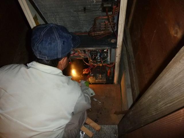 | 1階部分、階段下に設置が完了したので、冷媒管の接続をしていきます。 | ライトで照らしながら作業をしています。 | 2階にも同じエアコンがありますが、これは別なものにします。 |