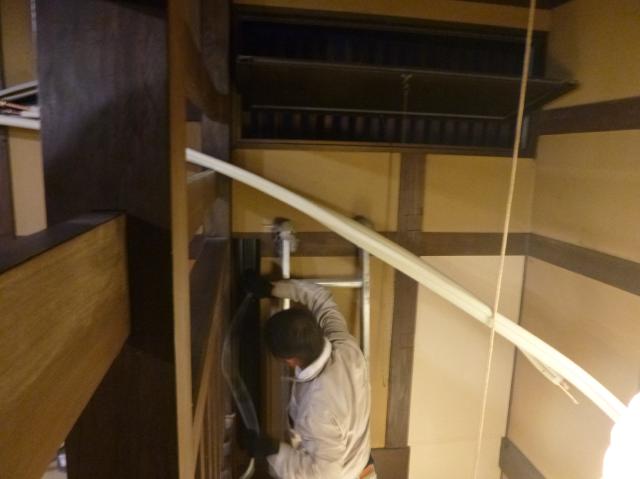 | 2階は壁掛のツインエアコンです。取り付けのための板金を固定します。 | 設置が完了したら、室外機へとつながる冷媒管を伸ばして外へ出します。 | 1階と2階の管をまとめて外へ出す作業をします。 |