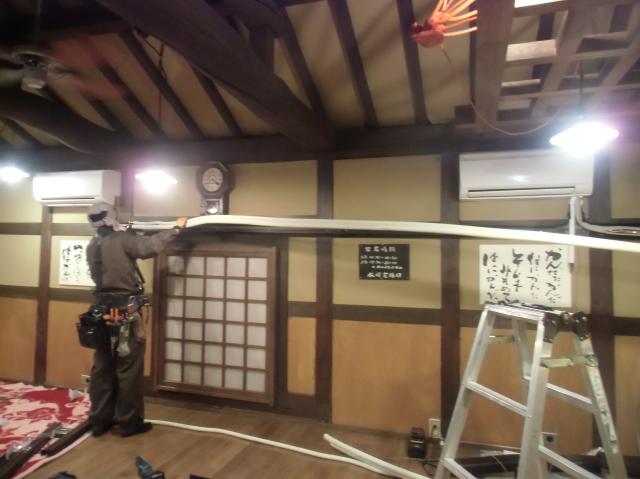| 最近、住宅リフォームでもルームエアコンの取り付け依頼を受けるようになってきました。エアコン取り付け又は取替えだけの依頼もあります。弊社のスタッフはビル建築なども経験しているので、今回のような店舗のエアコンシステムでも対応が十分可能です。 工事のやりにくい所でしたが、ご提案させていただきました。 |