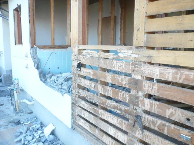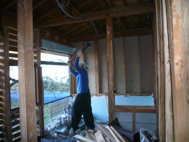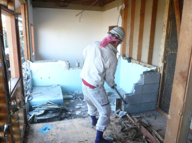 | 先ずは解体工事です。お風呂廻りはブロックが積んであるので、大ハンマーで壊していきます。 | 解体業者の職人さんですが、背丈が大きいので脚立を使わなくて作業ができます。日本語が堪能なブラジルの方でした。 | 外壁を解体していくと、シロアリに食われてる箇所が何箇所か出てきました。 |