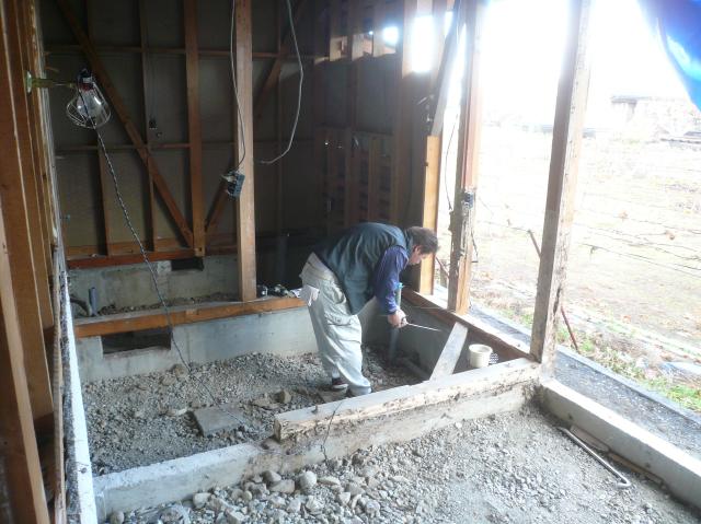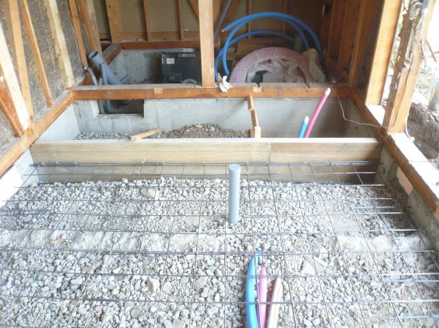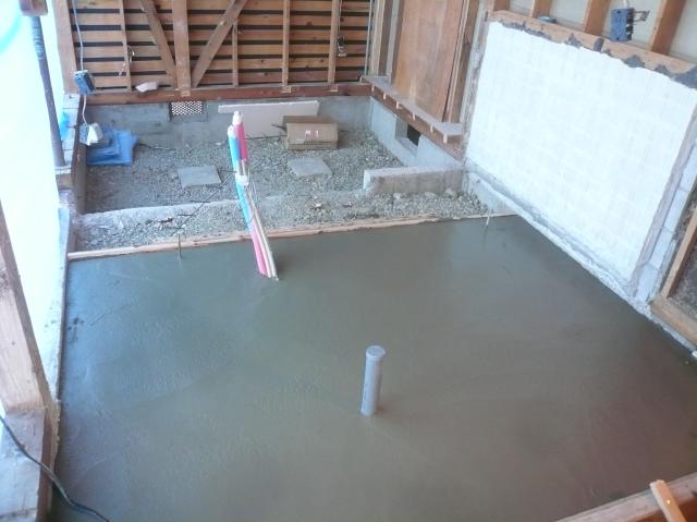 | 解体工事が終わり、ユニットバスと洗面脱衣室になる場所の、床下の配管工事をします。 | 配管工事が終わると、型枠を組みユニットバスの土間コンクリートを打つ準備をします。 | 一輪車でコンクリートを運び、土間コンクリートを均します。 |