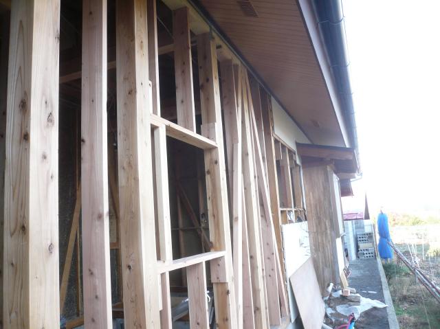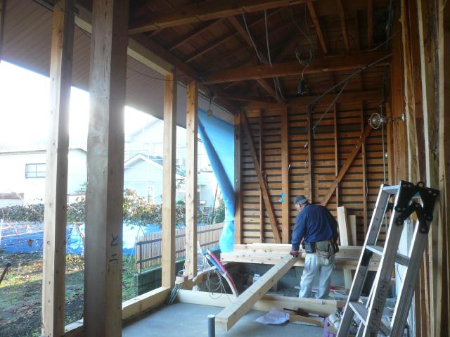 | 木工事です。思っていたより土台や柱がシロアリに食われていたので、入れ替えれる柱や土台は新しい物に取り替えます。 | 柱を抜く箇所は、梁を入れて補強します。棟梁が既存の桁と新しい桁をとボルトで縫っているところです。 | 外廻りの柱と間柱は全て入れ替えてしまいました。ひどい場所は、6尺の高さ位までシロアリが上がっていました。 |