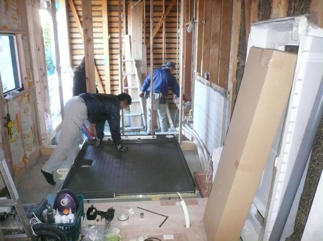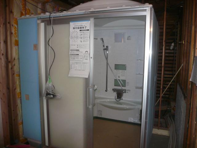 | ユニットバスの組立です。この現場は作業スペースが広いので、組立もスムーズに行きそうです。先ずは床をセットします。 | 壁のパネルを加工しながら、現場で組み立てて行きます。1.25坪のユニットバスなので広いですね。 | ユニットバスの組立が終わりました。後は大工さんが造作をしていきます。 |