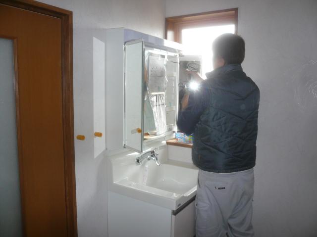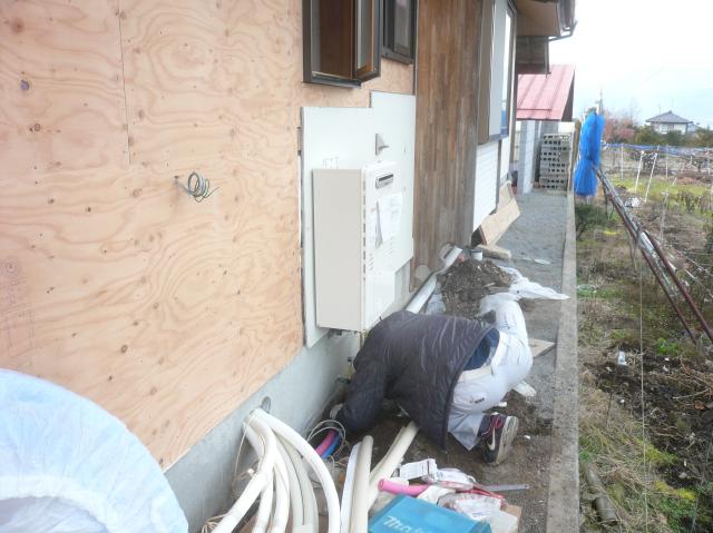 | 内装工事です。トイレと洗面脱衣室のクロスを貼っていきます。お施主さんが選んだクロスは、細かい模様のクロスなので苦労しています。 | 洗面化粧台を組み立てて、配管を接続して内部の作業はほぼ終了です。後は試運転をします。 | 外部では設備業者の職人が、給湯器を取付配管を接続しています。給湯器は床暖房兼用の給湯器になります。 |