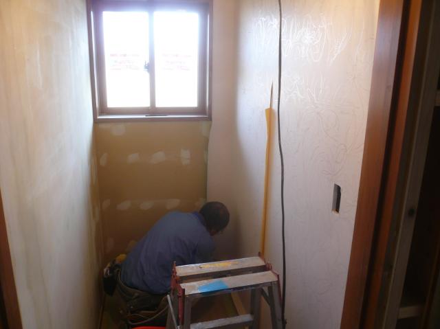 | 床のフローリングを張り、壁には断熱材を充填してボードを張っていきます。デットスペースが出来るので、収納を設けました。 | 外壁面はモルタルで仕上げますが、耐震を考えて12mmの構造合板で下地をします。沢山配管が見えるのは、床暖房の配管です。 | 木部の塗装工事です。フローリングの色に合わせて、色を調合します。調色はベテランの塗装工にならないと出来ません。 |
