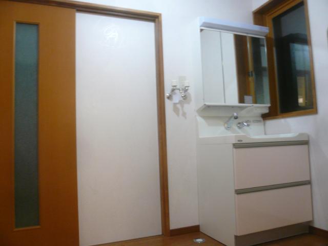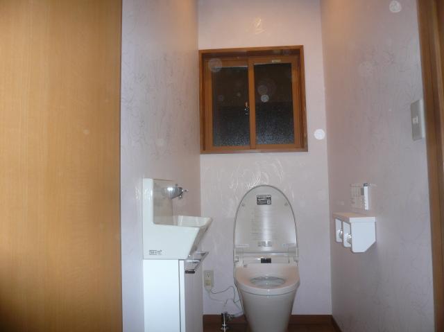 | 完成したトイレです。試運転をしましたが、床暖房がしっかりと効いて暖かいトイレになりました。 | ユニットバスの右側は少しスペースが出来たので、タオル等入れる収納を設けました。 | 洗面脱衣室の洗濯機置き場のスペースと、洗面化粧台です。1.5坪あるのでゆったりとしてます。 |