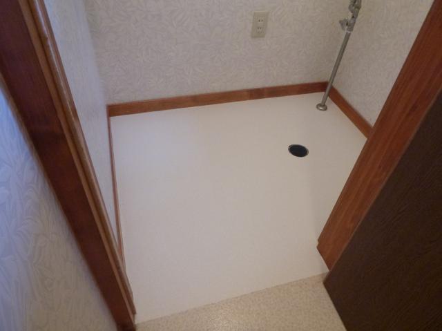 | 便器を取り外しました。跡が残ってしまったCFシートは張替えです。内装屋さんにバトンタッチ! | ゴミがつまらないように簡易的に配水管にビニール袋を詰めておきます。 | クロスをはがした後は、下地のジョイントに床用のパテを内装屋さんが塗っていきます。 |