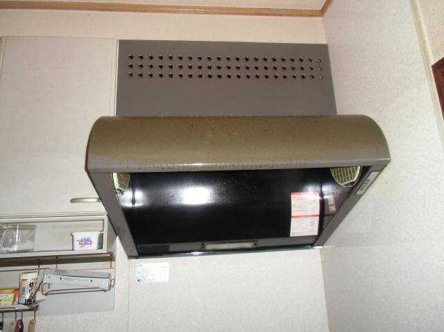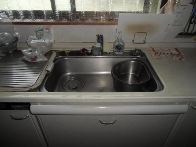 | 当時としては立派なシステムキッチンです。食洗機を必要としないため無駄なスペースになっていました。 | レンジフードもかなり大きく、吸い込みはとてもいいと思いますが掃除が大変そうです。 | 人工大理石のカウンターとステンレスのシンクの取り合いが汚れるようです。 |