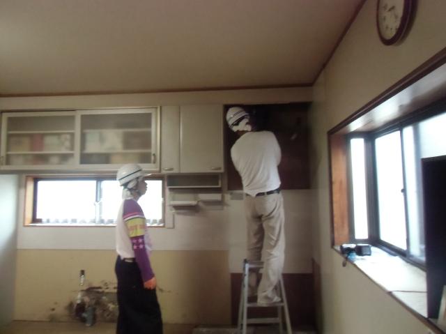 | キッチンの解体をします。 | カウンターを出します。大きいので二人がかりです。 | 換気扇を撤去します。 |