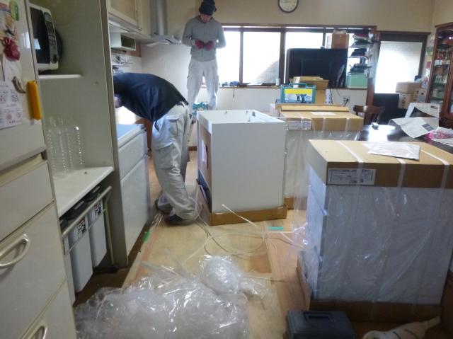 | システムキッチンを搬入しました。 | システムキッチンを設置していきます。 | 戸棚のレールや、本体を固定していきます。 |