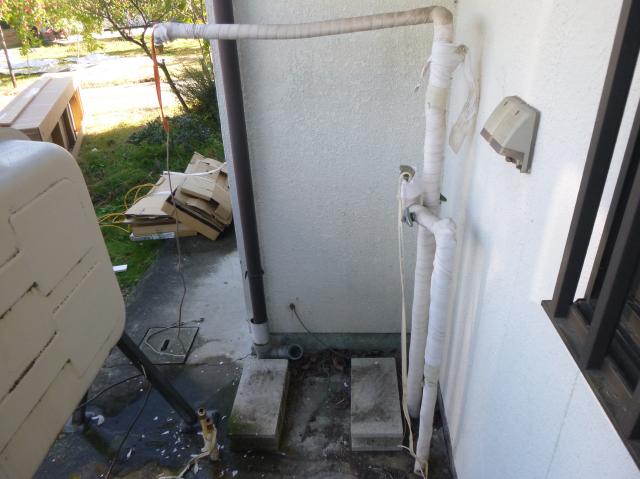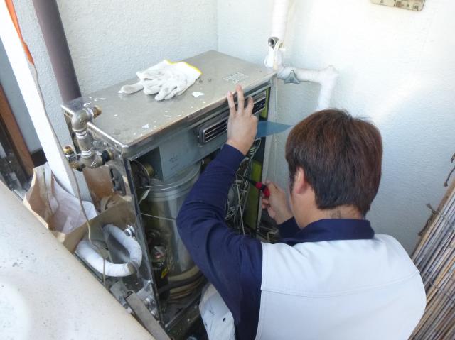 | 給湯器を取り替えます。貯湯式の給湯器ですので、大きいです。 | 撤去した後です。 | 新しい給湯器を接続します。直圧式の給湯器です。 |