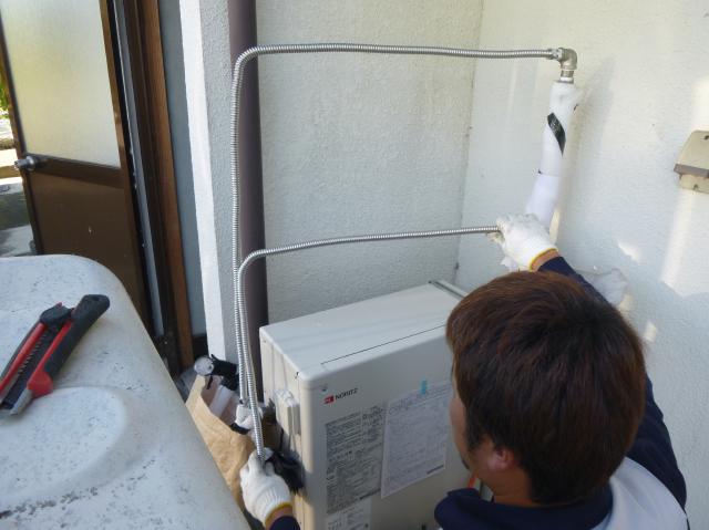 | リモコンも変えます。 | 設置完了です。 | キッチンへの配管を組んで、既存の給湯器へ繋ぎます。 |