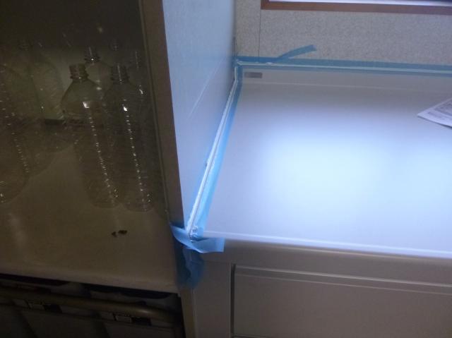 | 戸棚が入り、だんだんと完成に近づいてまいりました。 | 目地にはしっかりとコーキングを打ちます。 | 完成です。綺麗にやってもらいました。カウンター・シンクともに人工大理石です。 |