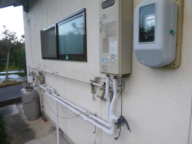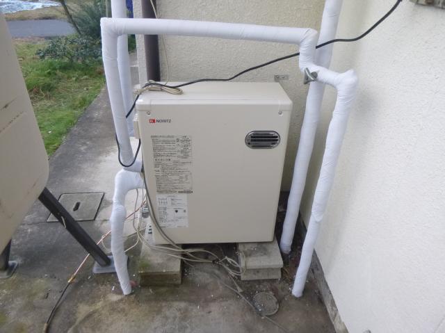 | 化粧テープを巻いて完成になります。 | キッチン配管の方にもしっかりと化粧テープを巻きます。 | 新しい給湯器も取替え完成しました。 |