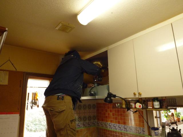 | キッチン組立のスペシャリストに来てもらいました。 | 既存フード本体の取り外しです。 | 新しいレンジフードを取り付けます。 |