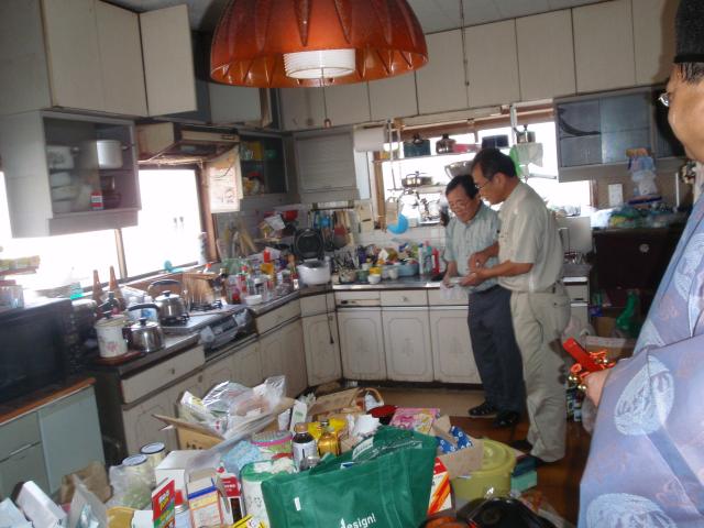 | 長年の荷物と、おじいちゃんの漬け物がキッチンを占領しています。 | 荷物がいっぱいでせっかくのL型キッチンも作業スペースが狭くなっています。 | 勝手口も付いているのですが、荷物がいっぱいで使っていません。 |