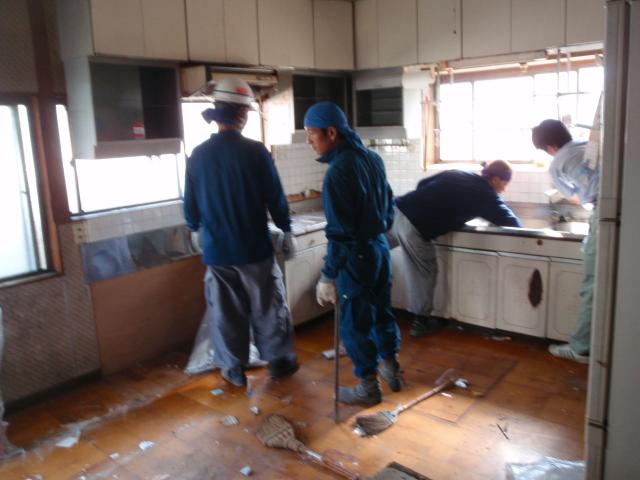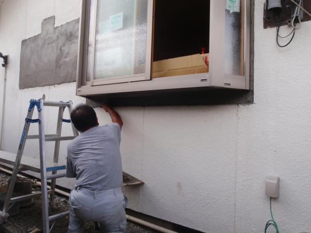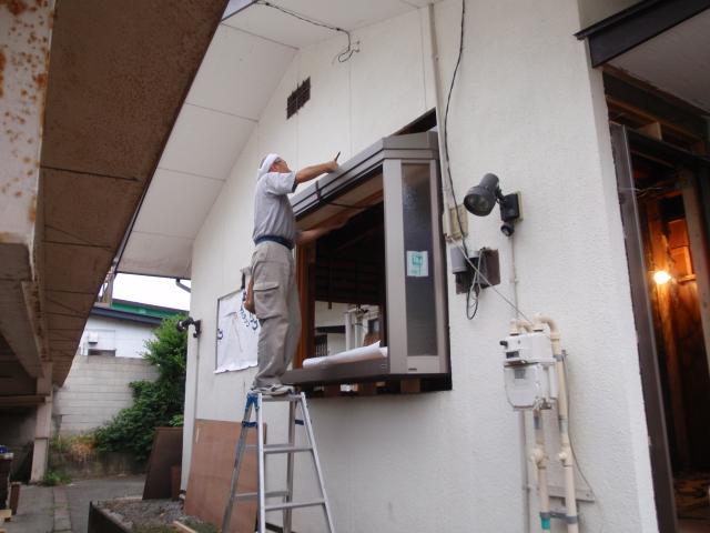 | いよいよ解体開始!キッチンの一部は生かし取りします。 | 窓の位置も変わるので、取り外します。 | 今まで使っていた流し台を残し、玄関に仮設のキッチンを作りました。 |