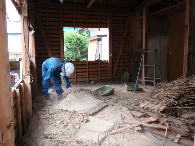 | 天井と壁の解体終了。おじいちゃんが出てきて『筋交いが入っていない!』土壁の向こう側にあるはずですよと説明はしたのですが・・・ | どうにも見ないと収まらないので、土壁も解体撤去することに、 ホラッ!あったでしょう、立派な筋交いが・・・ |