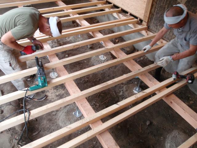 | 大引、根太の工事です。束は金属製でジャッキ式の物を使用します。 | エポキシボンドとコンクリートビスを併用して、束の浮き上がりと音鳴りを防止します。 | 床下の設備配管も同時に行っていきます。 |