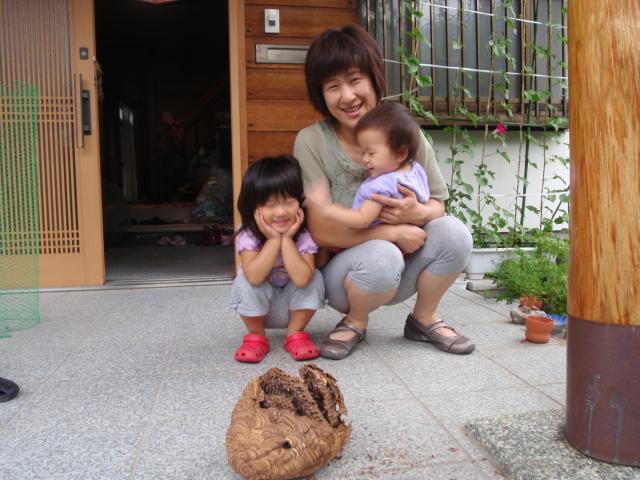 | 天井裏の矢切付近に、スズメバチの巣がありました。古い巣のためもうスズメバチはいませんでしたが、巣を撤去して、またはいらないように、矢切の内側に網を張りました。 | ほら!大きなスズメバチの巣、刺されたら大変だぞ~! | 天然無垢のフローリング張り、厚みは15㎜のナラ無垢材です。 湿気による伸び縮があるため、厚みゲージをはめ込み、隙間を空けてフローリングを張っていきます。 |