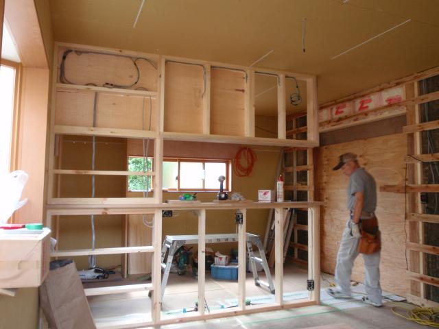 | キッチンを設置するための間仕切りを作ります。 その中に電気の配線がいっぱい。キッチンといえども電化製品のごとく電気が必要です。 |