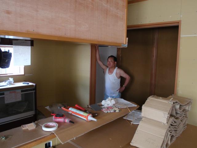 室内のカウンターの塗装。 これは、内装(クロス貼り)の前に行います。そうしないとクロスのちり際が塗料で汚れてしまうからです。 |