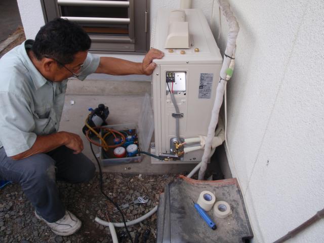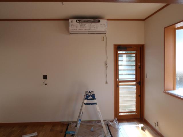 | クロスを張る前に下地処理、パテ処理です。 | エアコン取付完了。家庭用では一番の大きなタイプ。冬の暖房にも使用可能です。 | エアコン取付、ガスを通す前に必ず真空引きを行います。これをやらないと効き目が悪く、故障の原因にもなります。 |