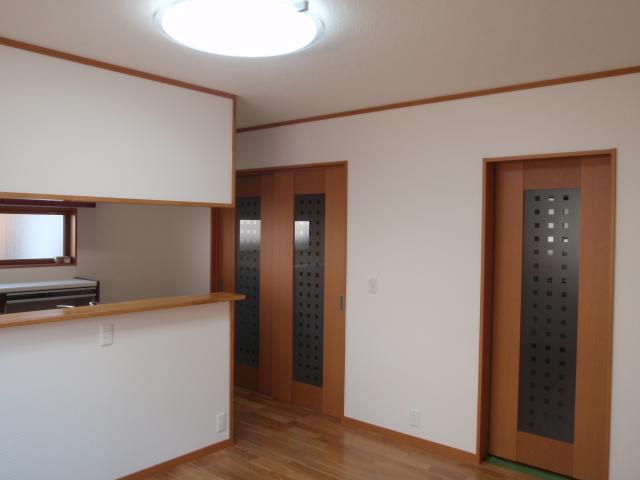 | ダイニング側から見たキッチン、カウンター手前にダイニングテーブルを置く予定です。 | 白を基調とした明るく清潔感のあるダイニングになりました。出入口の引戸がいいですね。 | 外部の納まりです。ガラスが上下にスライドする勝手口ドアは、換気をしたまま出かけられるので、とても便利です。 |