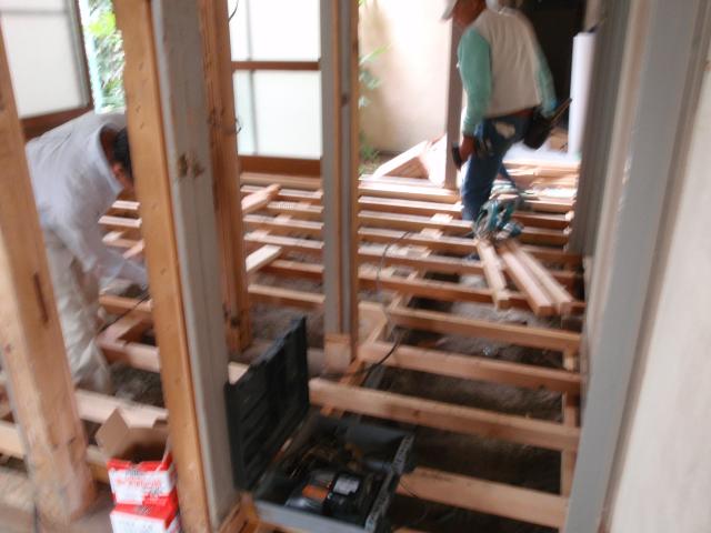 | まずは解体から、かなり家の勾配が狂っているようです | 床組です。今回は大引から新規にやり替える事にしましたが、、既存の床は2寸以上も違っていました。 | 新しい床は、真っ平らに! 暖房器具用のガス工事も行います |